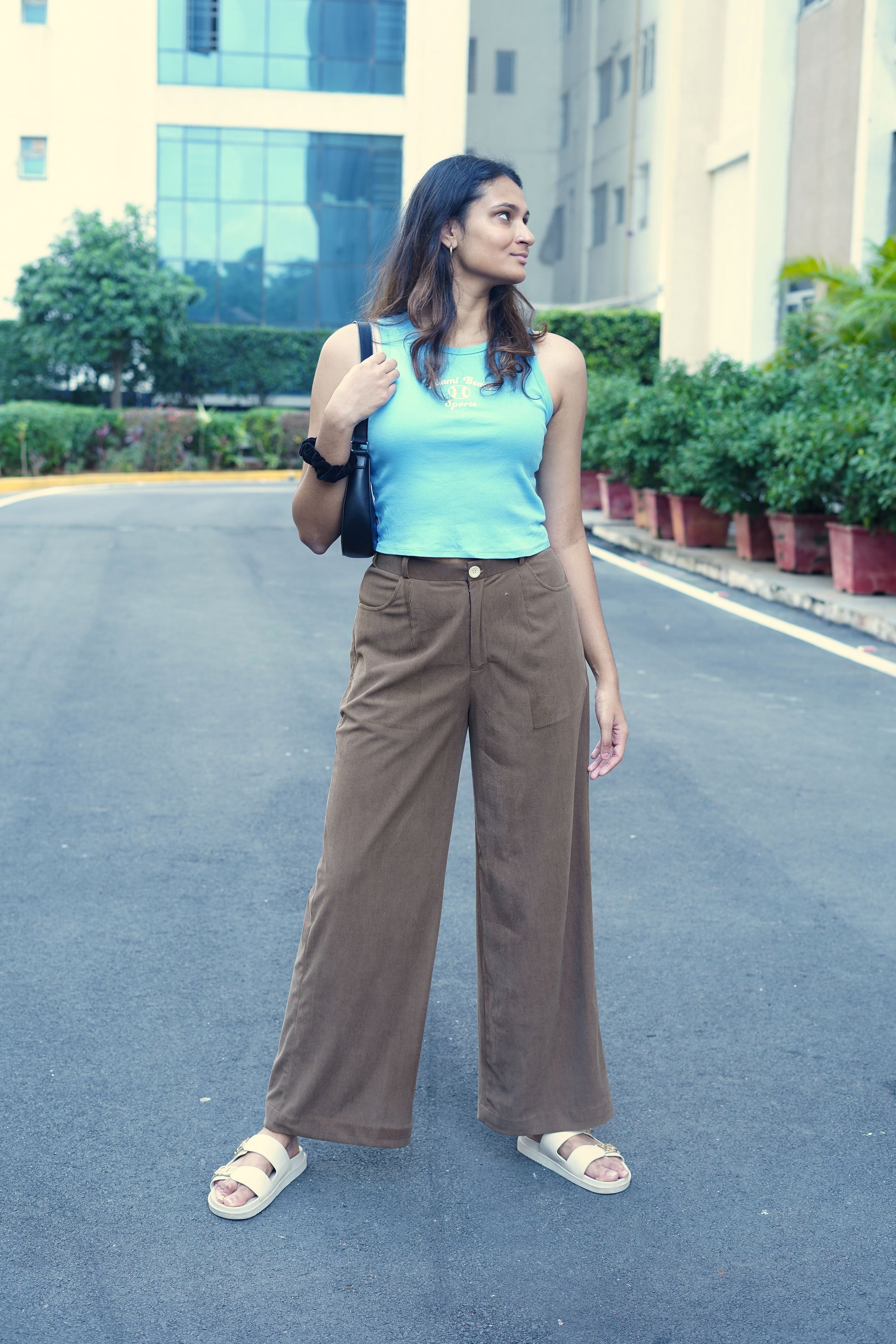Start at the top of the pant's waistband and run the tape down to the bottom edge of the pant's leg.